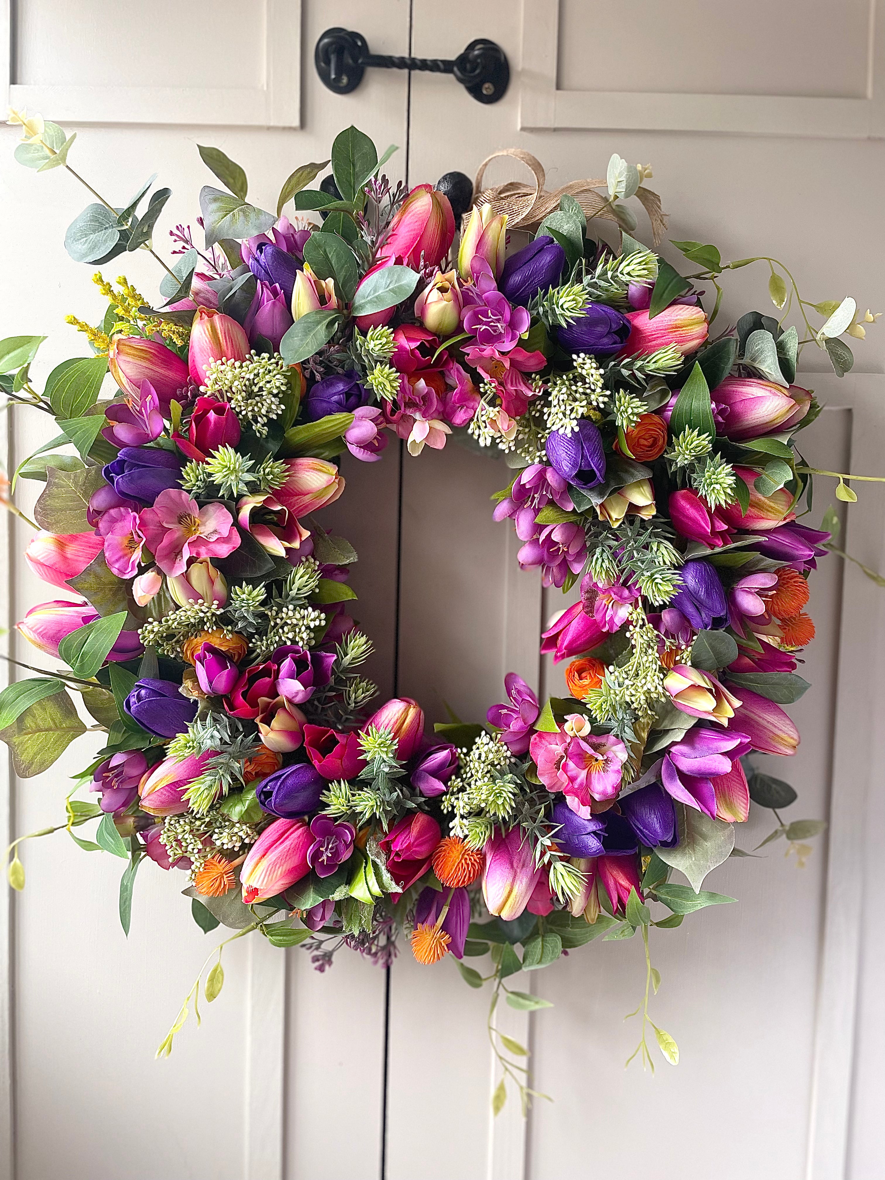 Add a touch of beauty to your home decor with this unique flower wreath that blooms all year round.The delightful “ELEANOR” spring tulip has to be the most vivid and colourful design