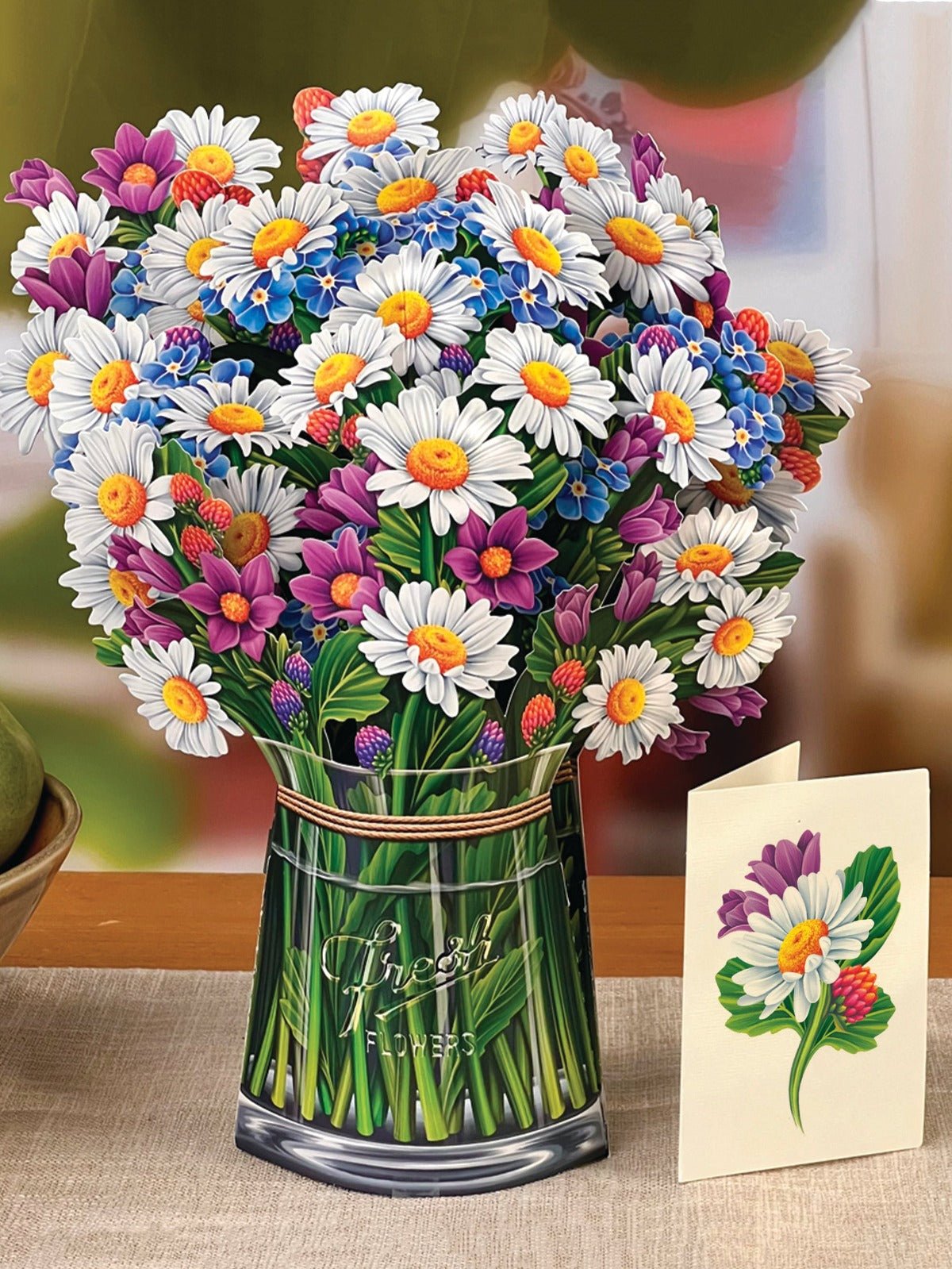 FreshCut Paper’s bountiful Field of Daisies bouquet captures the essence of freshly gathered wildflowers in the foothills of Colorado. This charming pop up bouquet symbolizes friendship and new beginnings with its abundance of daisies and wildflowers arranged in a classic embossed vase. Overflowing with natural beauty, this bouquet is sure to brighten anyone's day and bring a genuine smile to their face.