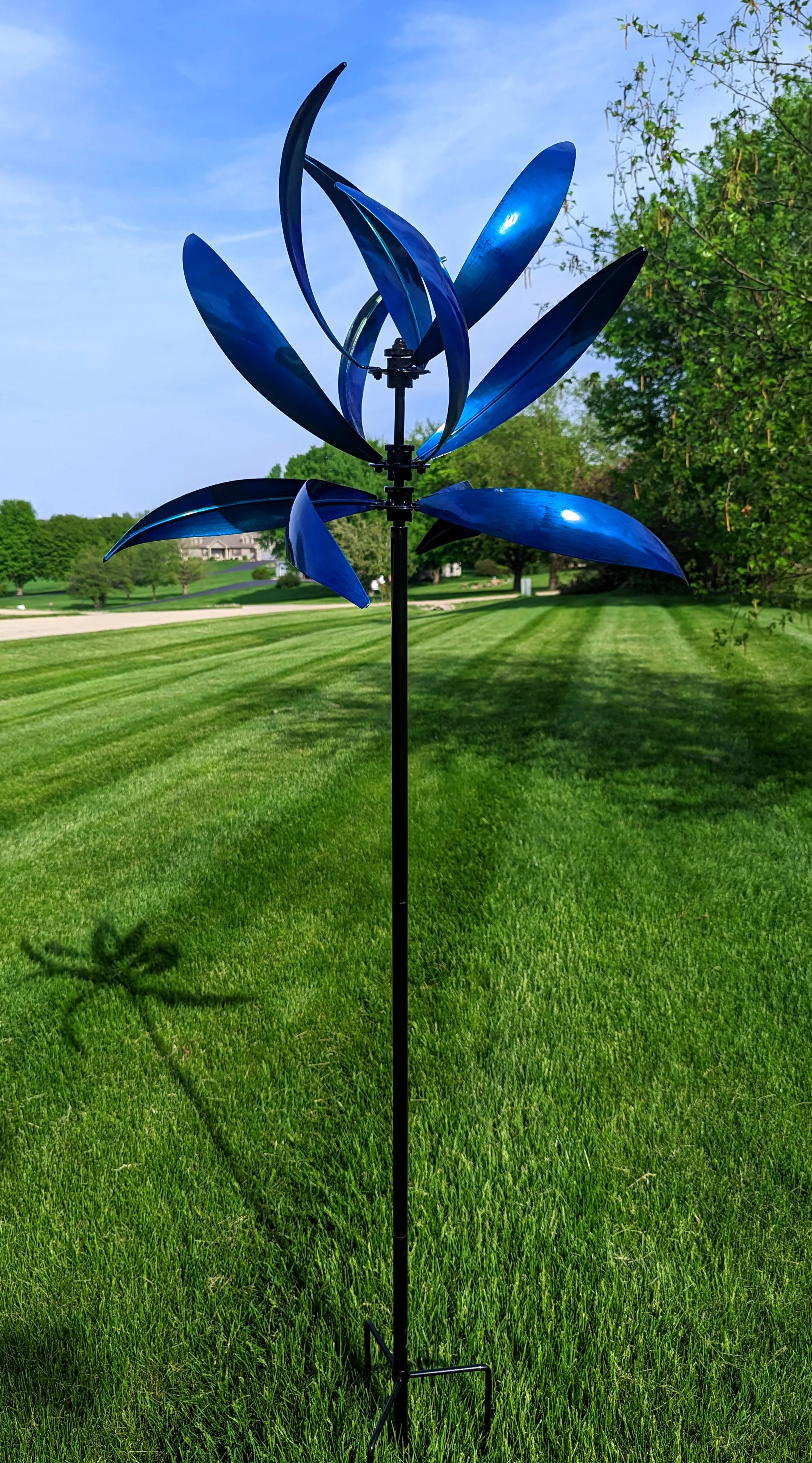As the wind spins this metal art, you can show off your creativity and create a beautiful display in your yard.