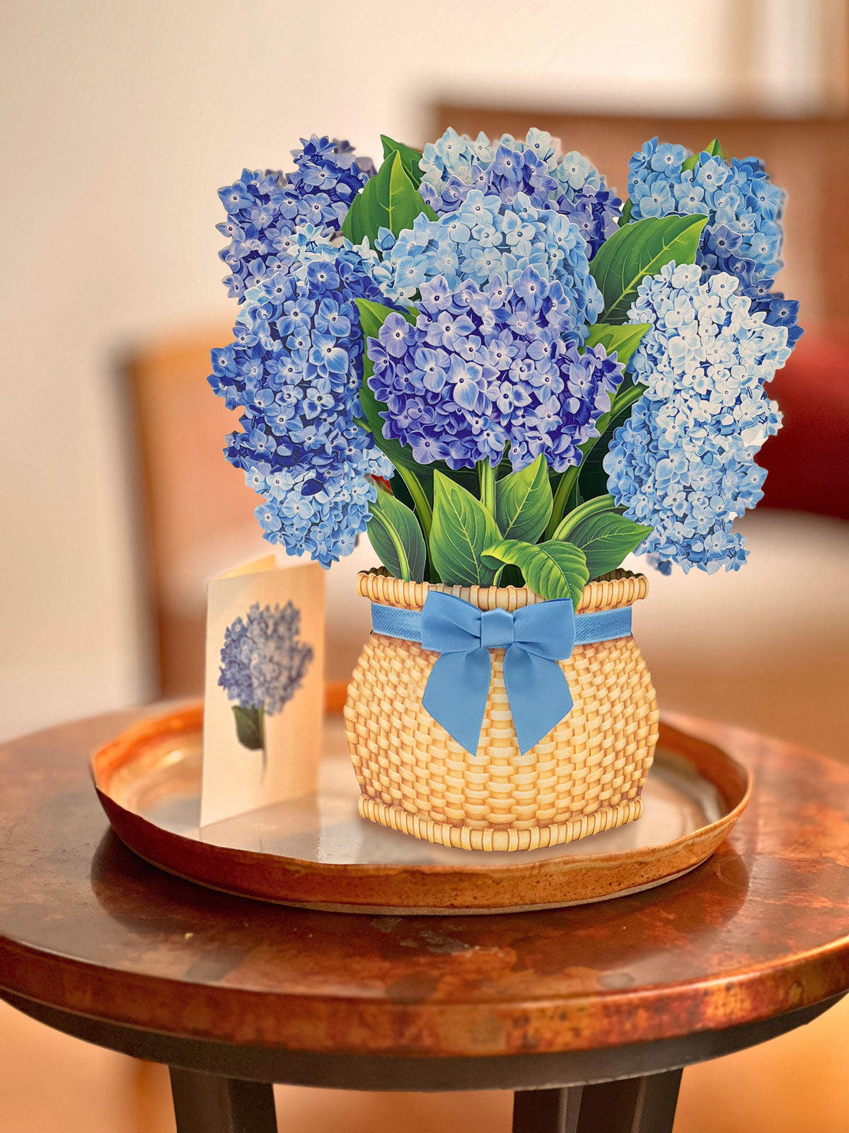 Our hydrangea bouquet is inspired by the sweet sea breeze and traditional basketry of Nantucket with a real satin bow. Its delicate blossoms in shades of cerulean, indigo, and powder blue capture the essence and serenity of an oceanscape. This timeless favorite is not only visually stunning, but also a symbol of gratitude, understanding, and harmony. Give the gift of tranquility and grace with this exquisite bouquet.