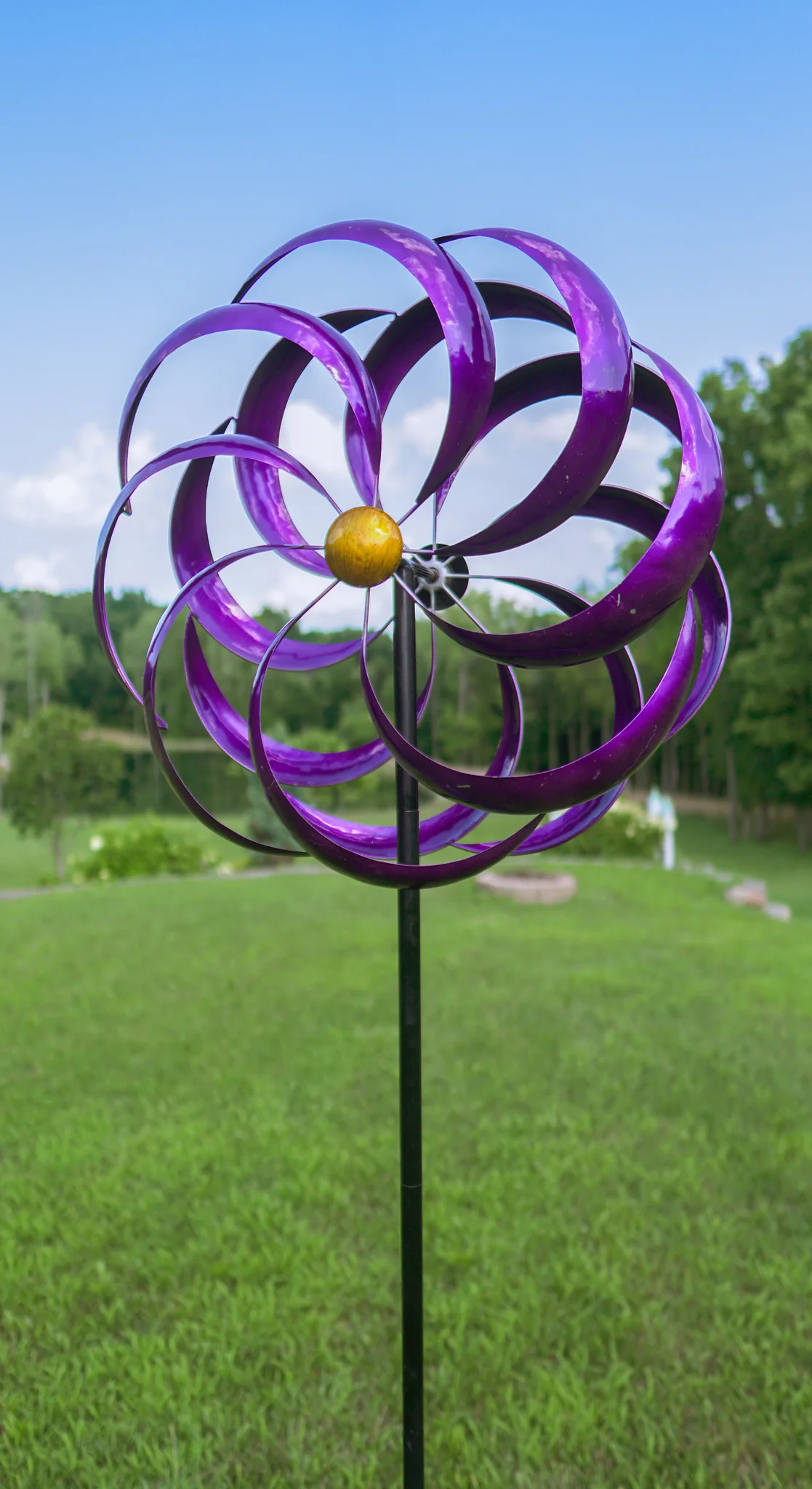 As the wind spins this metal art, you can show off your creativity and create a beautiful display in your yard.