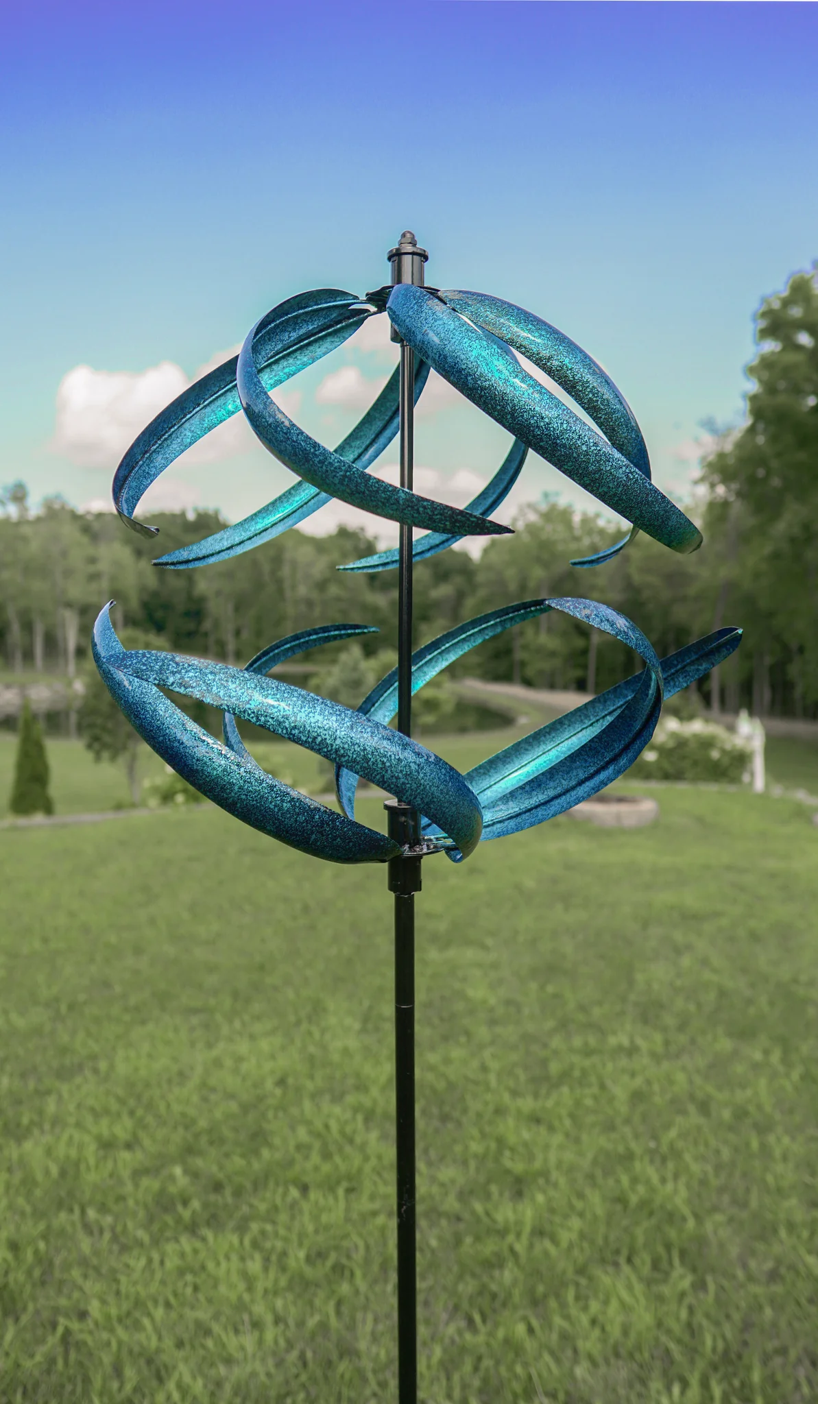 As the wind spins this metal art, you can show off your creativity and create a beautiful display in your yard.